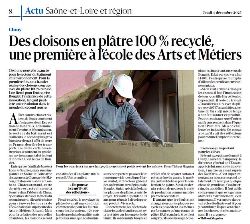 Revue de presse : Des cloisons en plâtre 100 % recyclé, une première à l'école des Arts et Métiers jeudi 18 décembre 2025 +